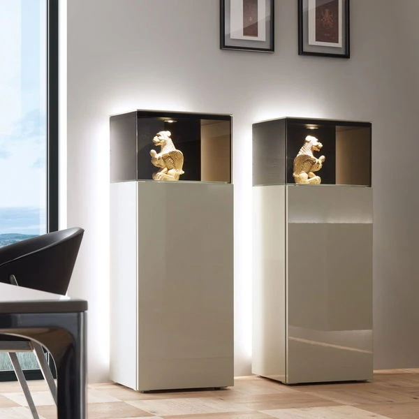 Für diese hülsta Gentis 8R Vitrine ist die Installation einer indirekten Beleuchtung möglich (siehe Foto). Diese besteht aus einem Funktionsrahmen (Holz weiß) und der entsprechenden LED-Beleuchtung für den Funktionsrahmen. Gesteuert wird die Beleuchtung über eine 4-Kanal-Funkfernbedienung mit Farbtemperaturwechsel (kaltweiß – 6500K bis warmweiß – 2700K).