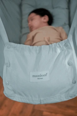 Die Moonboon Federwiege überzeugt mit eleganten Querstange in dunklem Nussbaumholz, einer Matratze mit 100% natürlicher, hypoallerger Kapokfüllung und Stoffseiten aus weicher, ökologischer Baumwolle. So schläft ihr Baby sicher und geborgen.
