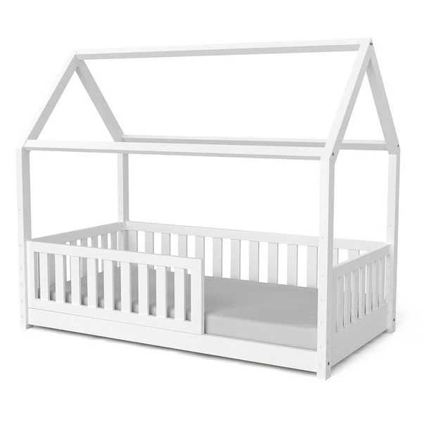 Das Hausbett Lilly lässt sich in der Liegehöhe verstellen, entweder bodentief oder 20 cm hoch und der 30 cm hohe Herausfallschutz ist links oder rechts montierbar. Für eine bessere Kopffreiheit der Eltern kann der vordere Dachbalken auch weggelassen werden, ohne dass die Stabilität des Bettes beeinträchtigt ist.