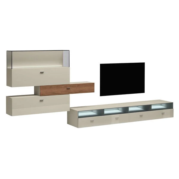 Der Korpus ist in Lack-seidengrau gehalten. Die Front ist in Lack-Hochglanz-seidengrau mit Akzent in Kernnussbaum.