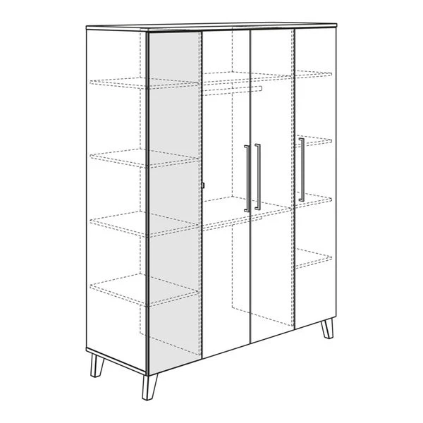 Der Kleiderschrank ist mit 4 Türen ausgestattet. Der Innenraum ist durch zwei Mittelwänd unterteilt. In der Mitte befinden sich 2 breite Einlegeböden und 2 breite Kleiderstangen, Links und Rechts befinden sich jeweils 4 Einlegeböden.