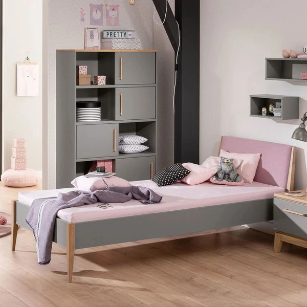 Paidi Sten Traumliege Eiche massiv/schiefergrau, gepolstert Dunkelrosa – 120×200 cm