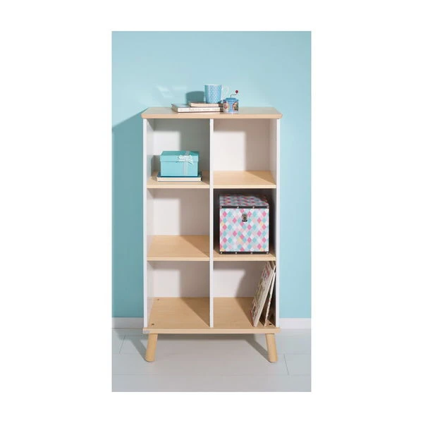 Das Paidi Regal hat 4 Fachböden in Birke natur, die Mittelwand ist kreideweiß. Deckplatte, Sockel und Füße sind aus massiver Birke gefertigt.