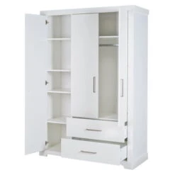 Der Kleiderschrank Maxi ist mit 3 Türen und 2 Schubladen ausgestattet. Innen befindet sich 4 Einlegeböden und 1 Kleiderstangen.
