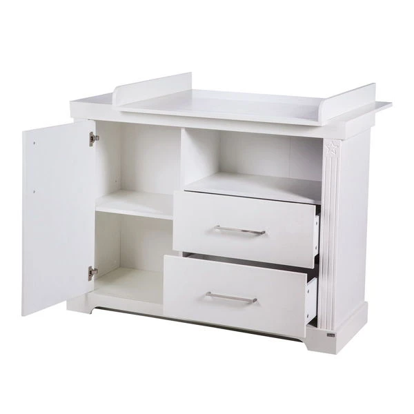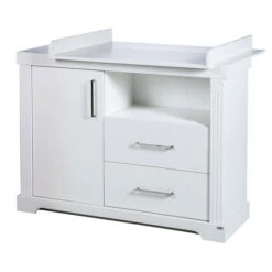 Die Wickelkommode Maxi ist mit 1 Tür, 2 Schubladen und 1 offenen Fach ausgestattet. Sie wird inklusive Wickelansatz, der jederzeit an die Kommode angesetzt und auch abgenommen werden kann, geliefert.
