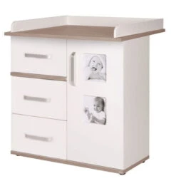 Die Wickelkommode ist mit einem abnehmbaren Wickelansatz ausgestattet. Die 3 Schubladen bieten sehr viel Platz und Stauraum für Windeln und andere Dinge. Der Innenraum hinter der Tür der Kommode ist durch einen Einlegeboden unterteilt. Die integrierten Bilderrahmen können mit persönlichen Fotos bestückt werden und machen die Wickelkommode so zu einem Unikat.
