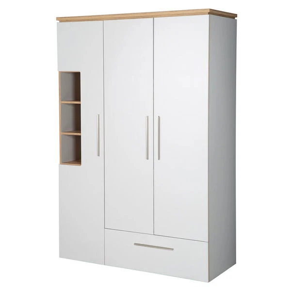 Der Kleiderschrank Tobi ist mit 3 Türen, 3 offene Fächer und 1 Schubkästen ausgestattet. Mit 1 Kleiderstange. Türen und Schubkästen mit Softclose.