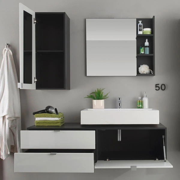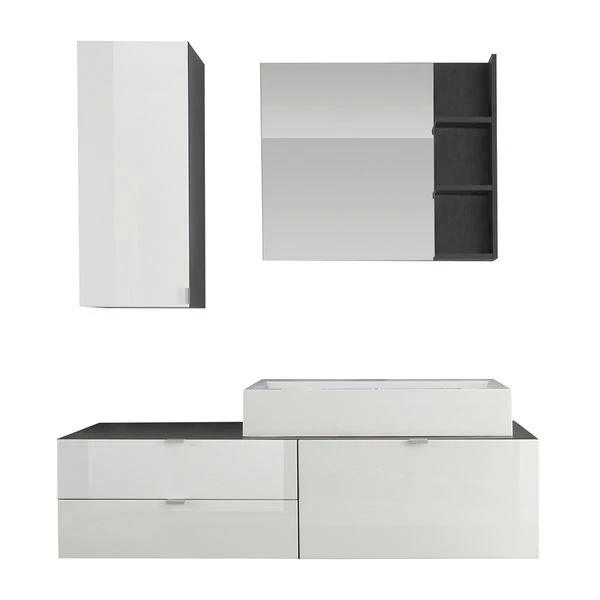 - bestehend aus Hänge-Waschbeckenunterschrank, Wandspiegel mit Ablage, Hängeschrank mit Innenspiegel und Mineralguss-Aufsatzwaschbecken