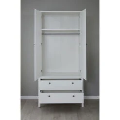 Der Kleiderschrank ist mit 2 Türen ausgestattet. Mit 1 Kleiderstange und 2 Schubkästen bietet er eine Menge Platz für die gesamte Babykleidung.