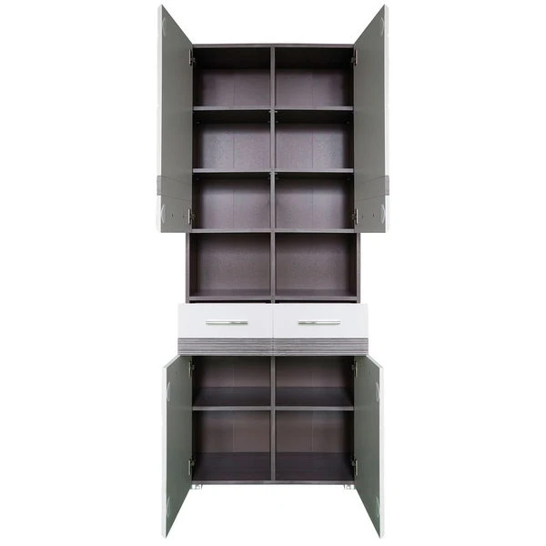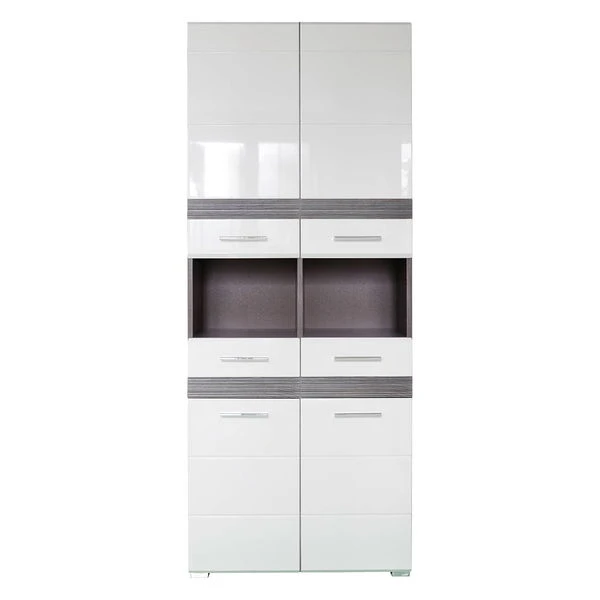 Der trendteam Set-One Bad Hochschrank ergänzt Ihre Einrichtung um ein trendiges Highlight, er sorgt für den Stauraum, den Sie brauchen. Der rauchsilberfarbene Korpus im Sardegna Dekor kombiniert mit der weißen Front in dekorativer Hochglanz Tiefzieh Optik schafft einen zeitgemäßen Style. Die farbliche Gestaltung wird durch die silberfarbenen Griffe komplettiert. Die Nutzung von Dekorfolie in Kombination mit Melamin schafft eine extrem robuste Oberfläche.