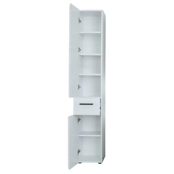 Der trendteam Skin Hochschrank ist eine stilsichere Lösung für besonders viel Stauraum, er offeriert eine Front in Weiß Hochgalnz. Die eingesetze Dekorfolie verleiht der Oberfläche Beständigkeit. Dank der weißen Front- und Korpusgestaltung wird das Design zum tollen Hingucker und passt sich erstklassig dem Raum an. Die farbliche Gestaltung wird durch die schwarzfarbenen Griffe vervollständigt.