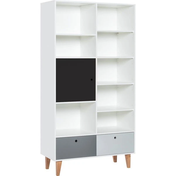 Das VOX Concept Bücherregal verfügt über 8 offene Fächer, 2 Schubkästen und 1 Tür. Er ist der beste Platz um die vielen Bücher unter zu bringen. Die Tür sowie die Schubkästen sind in verschiedenen Akzentfarben als Hingucker gehalten.